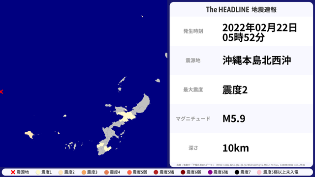 02月22日05時52分頃、沖縄本島北西沖を震源とするマグニチュード5.9の地震が観測された。最大震度2を観測したのは、沖縄県。