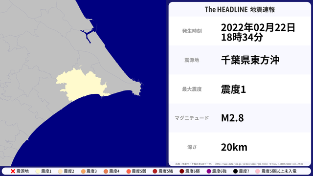 02月22日18時34分頃、千葉県東方沖を震源とするマグニチュード2.8の地震が観測された。最大震度1を観測したのは、千葉県。