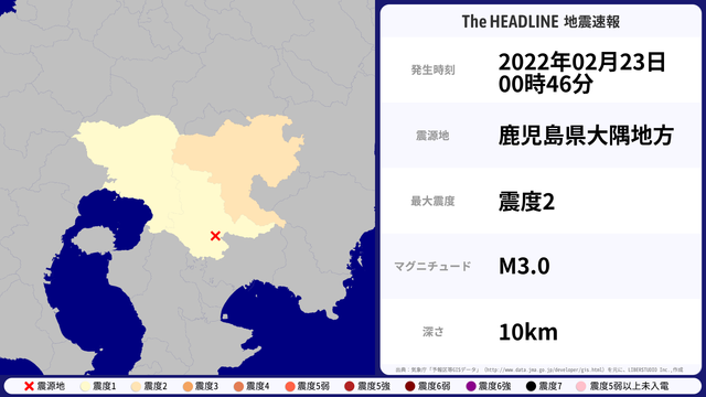 02月23日00時46分頃、鹿児島県大隅地方を震源とするマグニチュード3.0の地震が観測された。最大震度2を観測したのは、宮崎県。