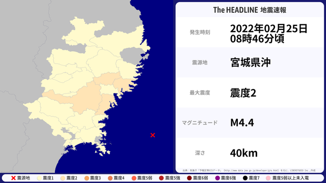 02月25日08時46分頃、宮城県沖を震源とするマグニチュード4.4の地震が観測された。最大震度2を観測したのは、岩手県・宮城県。