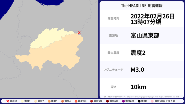 02月26日13時07分頃、富山県東部を震源とするマグニチュード3.0の地震が観測された。最大震度2を観測したのは、岐阜県。