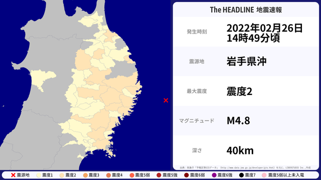 02月26日14時49分頃、岩手県沖を震源とするマグニチュード4.8の地震が観測された。最大震度2を観測したのは、青森県・岩手県など。