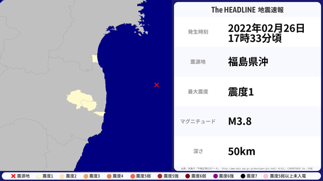 02月26日17時33分頃、福島県沖を震源とするマグニチュード3.8の地震が観測された。最大震度1を観測したのは、宮城県・福島県。