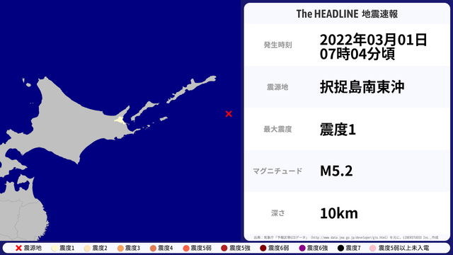 03月01日07時04分頃、択捉島南東沖を震源とするマグニチュード5.2の地震が観測された。最大震度1を観測したのは、北海道。