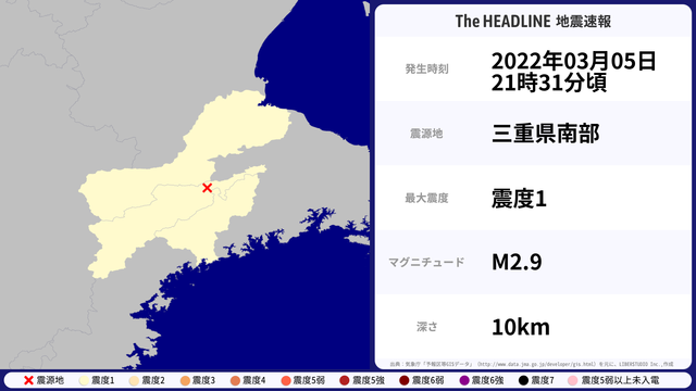 03月05日21時31分頃、三重県南部を震源とするマグニチュード2.9の地震が観測された。最大震度1を観測したのは、三重県。