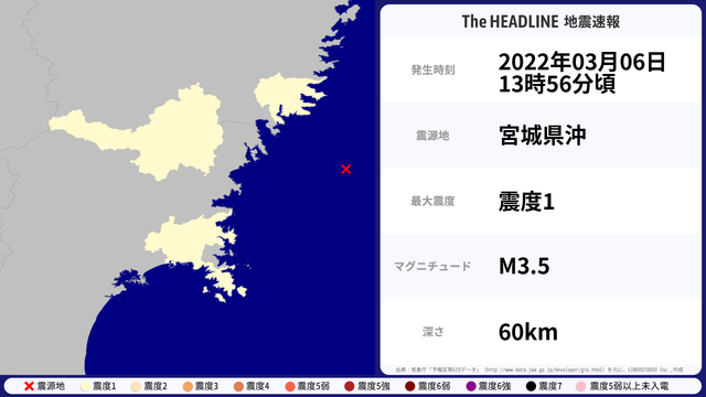 03月06日13時56分頃、宮城県沖を震源とするマグニチュード3.5の地震が観測された。最大震度1を観測したのは、岩手県・宮城県。