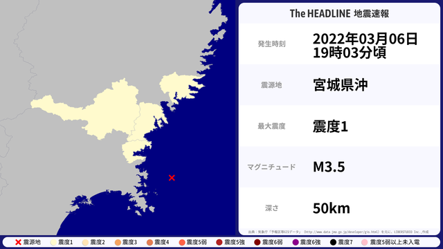 03月06日19時03分頃、宮城県沖を震源とするマグニチュード3.5の地震が観測された。最大震度1を観測したのは、岩手県・宮城県。