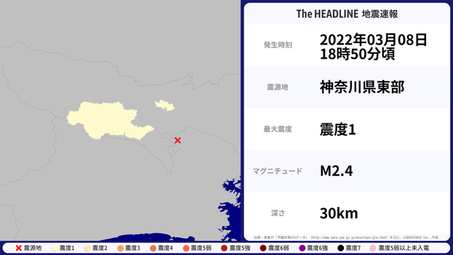 03月08日18時50分頃、神奈川県東部を震源とするマグニチュード2.4の地震が観測された。最大震度1を観測したのは、東京都。
