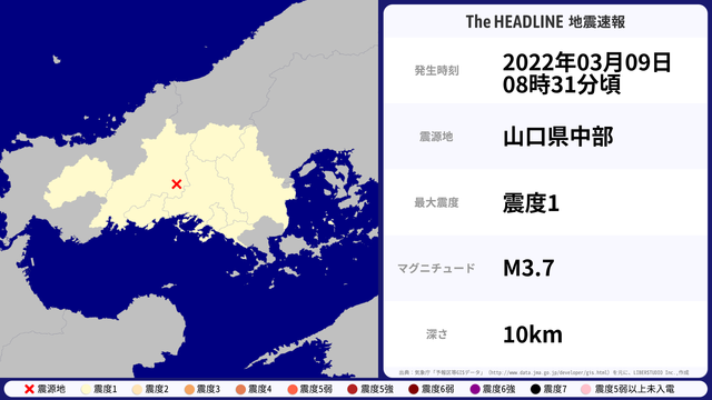 03月09日08時31分頃、山口県中部を震源とするマグニチュード3.7の地震が観測された。最大震度1を観測したのは、島根県・山口県。