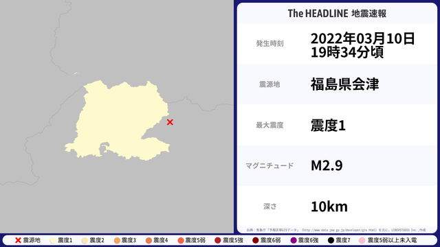 03月10日19時34分頃、福島県会津を震源とするマグニチュード2.9の地震が観測された。最大震度1を観測したのは、福島県。