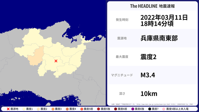 03月11日18時14分頃、兵庫県南東部を震源とするマグニチュード3.4の地震が観測された。最大震度2を観測したのは、兵庫県。