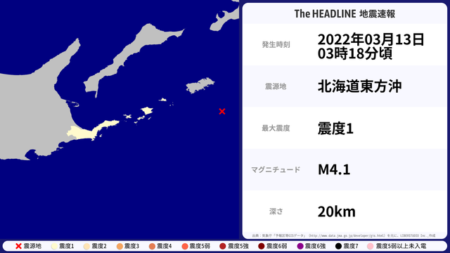 03月13日03時18分頃、北海道東方沖を震源とするマグニチュード4.1の地震が観測された。最大震度1を観測したのは、北海道。