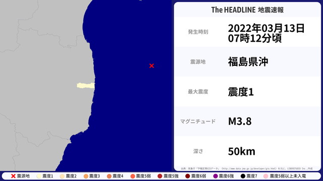 03月13日07時12分頃、福島県沖を震源とするマグニチュード3.8の地震が観測された。最大震度1を観測したのは、福島県。