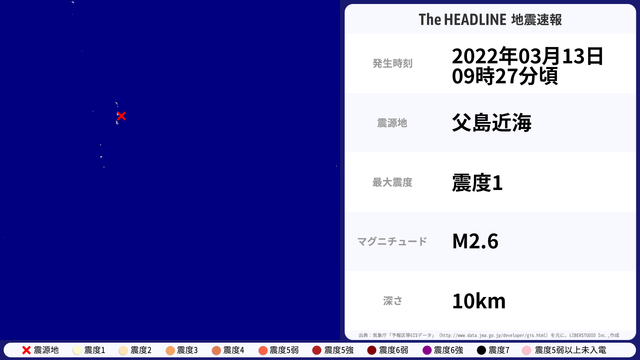 03月13日09時27分頃、父島近海を震源とするマグニチュード2.6の地震が観測された。最大震度1を観測したのは、東京都。