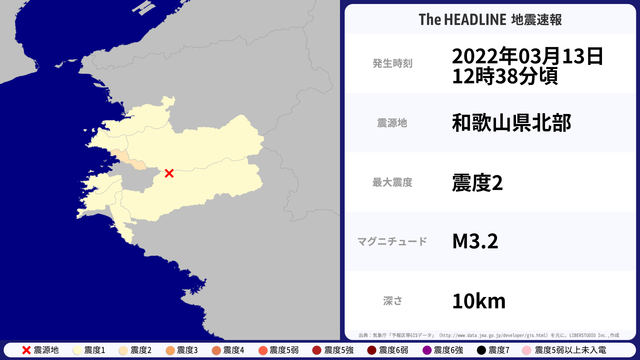 03月13日12時38分頃、和歌山県北部を震源とするマグニチュード3.2の地震が観測された。最大震度2を観測したのは、和歌山県。