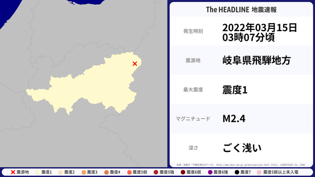 03月15日03時07分頃、岐阜県飛騨地方を震源とするマグニチュード2.4の地震が観測された。最大震度1を観測したのは、岐阜県。