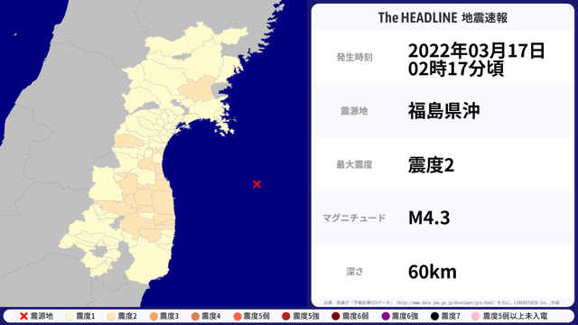 03月17日02時17分頃、福島県沖を震源とするマグニチュード4.3の地震が観測された。最大震度2を観測したのは、宮城県・福島県。