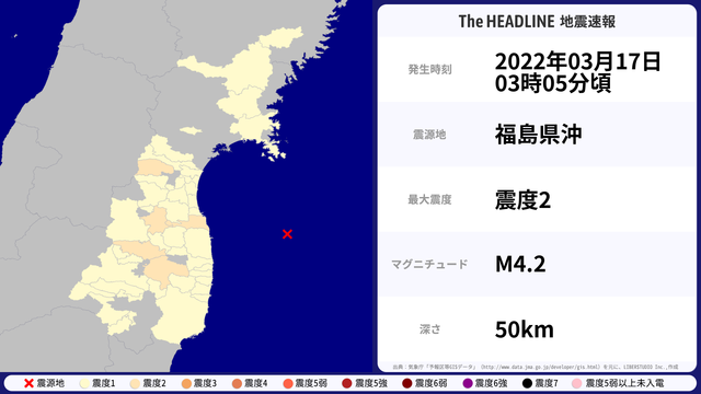 03月17日03時05分頃、福島県沖を震源とするマグニチュード4.2の地震が観測された。最大震度2を観測したのは、宮城県・福島県。