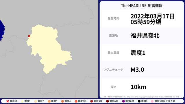 03月17日05時59分頃、福井県嶺北を震源とするマグニチュード3.0の地震が観測された。最大震度1を観測したのは、岐阜県。