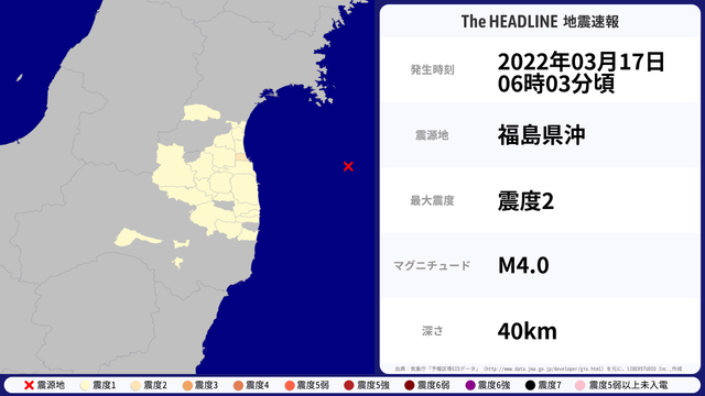 03月17日06時03分頃、福島県沖を震源とするマグニチュード4.0の地震が観測された。最大震度2を観測したのは、福島県。