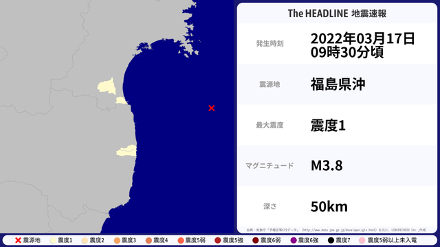 03月17日09時30分頃、福島県沖を震源とするマグニチュード3.8の地震が観測された。最大震度1を観測したのは、宮城県・福島県。