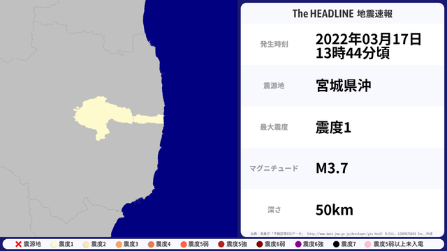 03月17日13時44分頃、宮城県沖を震源とするマグニチュード3.7の地震が観測された。最大震度1を観測したのは、福島県。