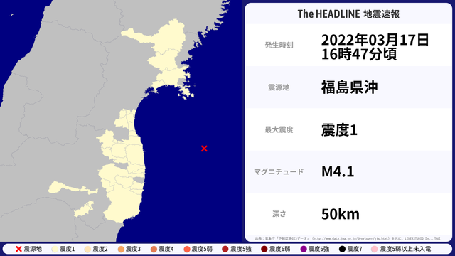 03月17日16時47分頃、福島県沖を震源とするマグニチュード4.1の地震が観測された。最大震度1を観測したのは、岩手県・宮城県など。