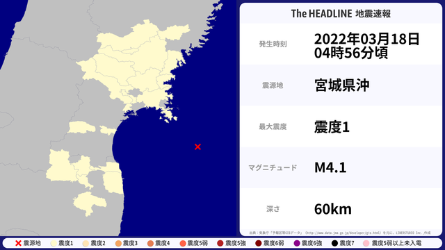 03月18日04時56分頃、宮城県沖を震源とするマグニチュード4.1の地震が観測された。最大震度1を観測したのは、岩手県・宮城県など。