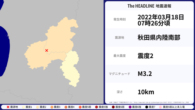 03月18日07時26分頃、秋田県内陸南部を震源とするマグニチュード3.2の地震が観測された。最大震度2を観測したのは、秋田県。