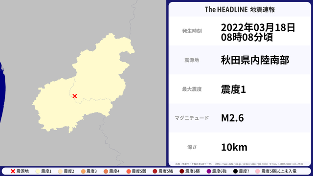 03月18日08時08分頃、秋田県内陸南部を震源とするマグニチュード2.6の地震が観測された。最大震度1を観測したのは、秋田県。
