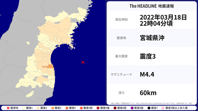 03月18日22時04分頃、宮城県沖を震源とするマグニチュード4.4の地震が観測された。最大震度3を観測したのは、福島県。