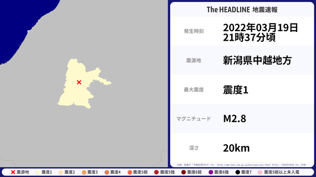 03月19日21時37分頃、新潟県中越地方を震源とするマグニチュード2.8の地震が観測された。最大震度1を観測したのは、新潟県。