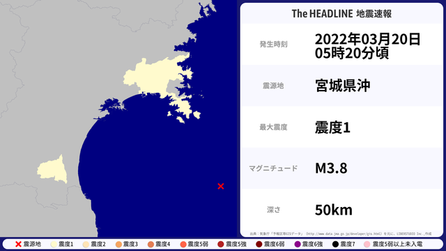 03月20日05時20分頃、宮城県沖を震源とするマグニチュード3.8の地震が観測された。最大震度1を観測したのは、宮城県。