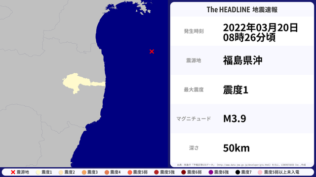 03月20日08時26分頃、福島県沖を震源とするマグニチュード3.9の地震が観測された。最大震度1を観測したのは、福島県。