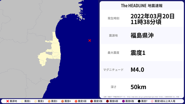 03月20日11時38分頃、福島県沖を震源とするマグニチュード4.0の地震が観測された。最大震度1を観測したのは、宮城県・福島県。