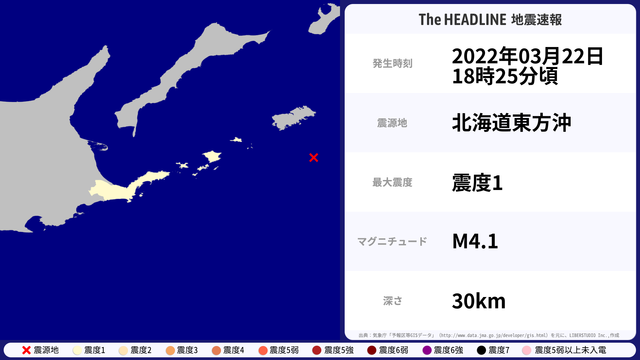 03月22日18時25分頃、北海道東方沖を震源とするマグニチュード4.1の地震が観測された。最大震度1を観測したのは、北海道。