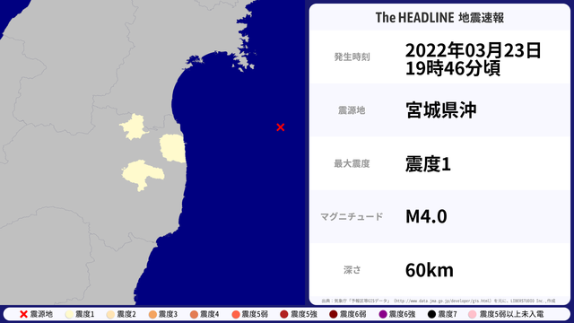 03月23日19時46分頃、宮城県沖を震源とするマグニチュード4.0の地震が観測された。最大震度1を観測したのは、福島県。