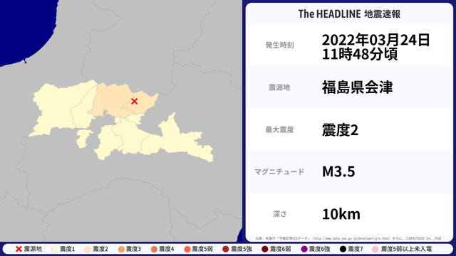 03月24日11時48分頃、福島県会津を震源とするマグニチュード3.5の地震が観測された。最大震度2を観測したのは、福島県。