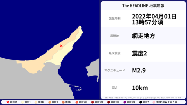 04月01日13時57分頃、網走地方を震源とするマグニチュード2.9の地震が観測された。最大震度2を観測したのは、北海道。