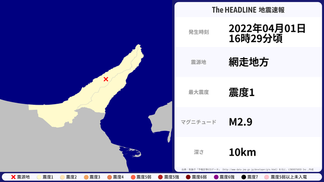 04月01日16時29分頃、網走地方を震源とするマグニチュード2.9の地震が観測された。最大震度1を観測したのは、北海道。