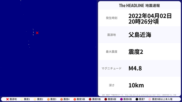 04月02日20時26分頃、父島近海を震源とするマグニチュード4.8の地震が観測された。最大震度2を観測したのは、東京都。