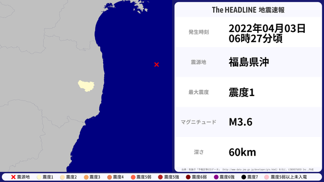 04月03日06時27分頃、福島県沖を震源とするマグニチュード3.6の地震が観測された。最大震度1を観測したのは、福島県。