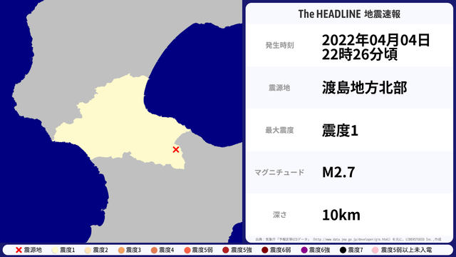 04月04日22時26分頃、渡島地方北部を震源とするマグニチュード2.7の地震が観測された。最大震度1を観測したのは、北海道。