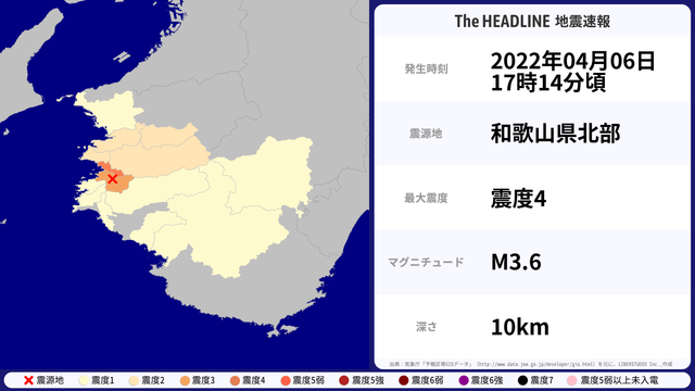 04月06日17時14分頃、和歌山県北部を震源とするマグニチュード3.6の地震が観測された。最大震度4を観測したのは、和歌山県。