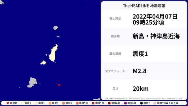 04月07日09時25分頃、新島・神津島近海を震源とするマグニチュード2.8の地震が観測された。最大震度1を観測したのは、東京都。