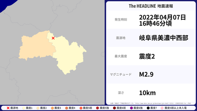 04月07日16時46分頃、岐阜県美濃中西部を震源とするマグニチュード2.9の地震が観測された。最大震度2を観測したのは、福井県。
