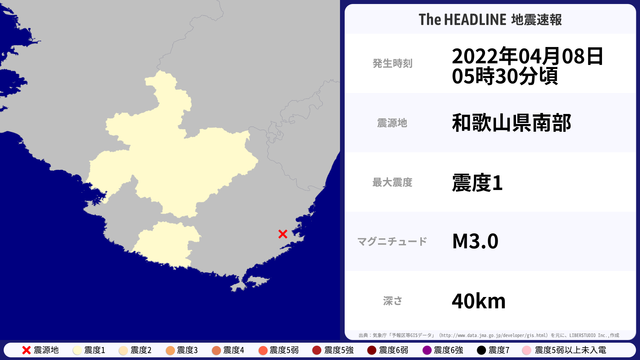 04月08日05時30分頃、和歌山県南部を震源とするマグニチュード3.0の地震が観測された。最大震度1を観測したのは、和歌山県。