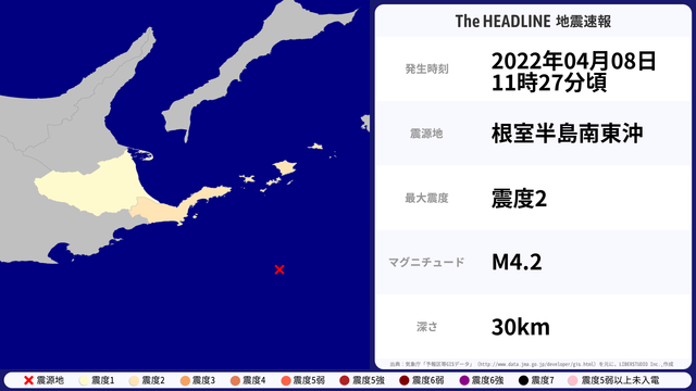 04月08日11時27分頃、根室半島南東沖を震源とするマグニチュード4.2の地震が観測された。最大震度2を観測したのは、北海道。