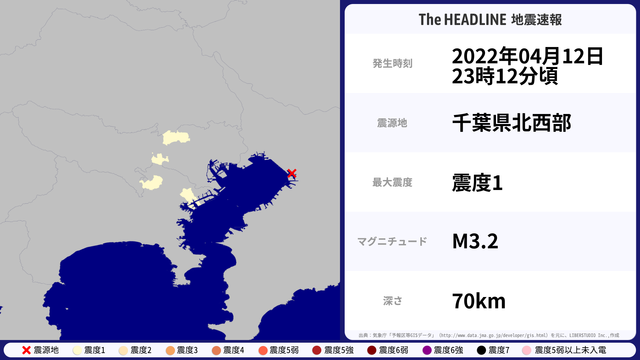 04月12日23時12分頃、千葉県北西部を震源とするマグニチュード3.2の地震が観測された。最大震度1を観測したのは、東京都・神奈川県。