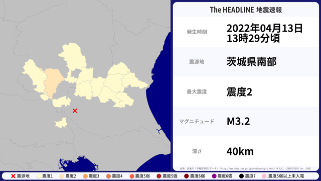 04月13日13時29分頃、茨城県南部を震源とするマグニチュード3.2の地震が観測された。最大震度2を観測したのは、栃木県。